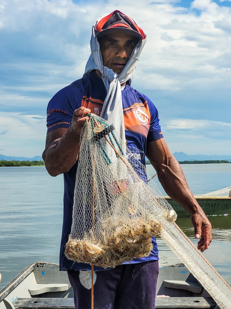 O camarão-branco é capturado com o berimbau. O apetrecho é uma espécie de rede de arrasto que é movimentado pela força das correntes de maré.