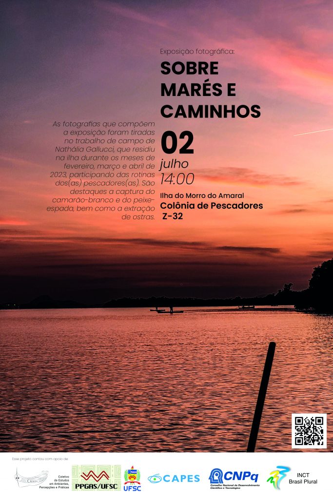 Essa exposição está sendo realizada como parte dos resultados da pesquisa de dissertação em Antropologia Social de Nathália Gallucci, “Sobre marés e caminhos: conhecimento e práticas dos(as) pescadores(as) da Ilha do Morro do Amaral, baía da Babitonga-SC”. Mostra o trabalho dos(as) pescadores(as), por meio das fotografias, de forma a valorizar a cultura local e a atividade de pesca em uma das comunidades mais antigas de Joinville.