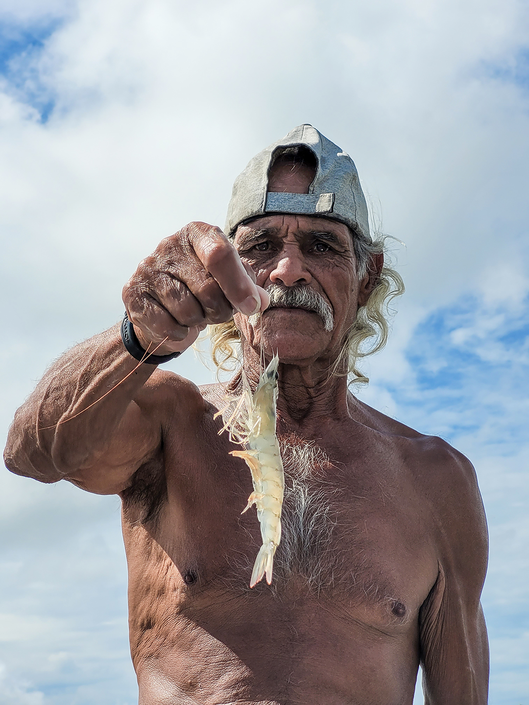 O camarão-branco é capturado com o berimbau. O apetrecho é uma espécie de rede de arrasto que é movimentado pela força das correntes de maré.